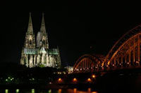 Посвященный святым Петру и Марии, Кельнский Собор (Kоlner Dom) является местом католического Архиепископа Кельна. Кельнский Собор - самый большой Готический собор в Германии и был самым известным ориентиром Кельна в течение многих столетий. Когда – то он был самым высоким зданием в мире; Кельнский Собор все еще имеет самый большой в мире церковный фасад. Главное сокровище собора - золотая гробница, содержащая остатки Трех Волхвов из известной Рождественской истории. Эти реликвии и другие сокровища сделали кельнский Собор главным предназначением паломничества в течение многих столетий. Кельнский Собор стоит на месте римского храма 4-ого столетия, квадратное здание, известное как "самый старый собор" и место Матернуса (Maternus), первого христианского епископа Кельна. Вторая церковь была основана на этом месте, - "Старый Собор", была закончена в 818 году. 30 апреля 1248 она сгорела дотла. Строительство существующей Готической церкви началось в 13-ом столетии и продлилось, с перерывами, больше чем 600 лет. Собор был построен, чтобы предоставить место хранения реликвиям Волхвов, взятых из Милана Святым римским Императором Фредриком Барароссой и отданных Архиепископу Кельна, Райнальду фон Дасселу (Rainald von Dassel) в 1164 году. Камень фундамента был положен 15 августа 1248 года, Архиепископом Конрадом фон Хокстаденом (Konrad von Hochstaden), и клирос был освящен в 1322 году. После этого начального быстрого продвижения строительные работы постепенно заходили в тупик, и к году 1560, только корпус был построен. Только с 19-ым столетием Романтичный энтузиазм по поводу Средневековья и обязательства прусского двора привели к окончанию строительных работ. 1824 год видел дополнение башен и других существенных частей собора, главным образом, согласно выжившим средневековым планам и рисункам. Завершение наибольшего собора Германии праздновалось как национальное событие в 1880 году, спустя 632 года после того, как строительство началось. Празднование было посещено Императором Вильгельмом I. Собор перенес 14 бомбардировок Второй мировой войны, но не разрушился, и его послевоенная реконструкция была закончена в 1956 году. В основании северо-западной башни был проведен чрезвычайный ремонт, выполненный с плохим качеством, каменные блоки были взяты с соседнего разрушенного здания, оставался видимым до конца 1990-ых как напоминание войны, но затем было решено восстановить эту секцию согласно оригинальному виду. Можно подняться по винтовой лестнице на смотровую платформу на приблизительно 98 метров выше основания. В 1996 году, собор был добавлен к Списку Наследия Мира ЮНЕСКО. В 2004 году, он был помещен в список "Мировое Наследие в Опасности". Внешность 19-ого столетия кельнского Собора является преданной оригинальными средневековыми планами, за исключением современной стальной крыши. Во время своего завершении, Кельнский Собор был самым высоким зданием в мире, настигая Страсбургский Собор. В 1884 году, он потерял этот титул из-за Вашингтонского Памятника, но Келнский Дом все еще имеет наибольший церковный фасад в мире. Здание редко полностью свободно от подмостей и работ по реконструкции, так как ветер, дождь, и загрязнение медленно разрушает камни. Dombauhutte, который делает ремонт, как говорят, нанимает лучших каменщиков Ринеланда. Внутри, самое знаменитое произведение искусства в соборе - Саркофаг